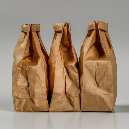 This image features three paper bags arranged on a neutral gray background, ideal for showcasing eco-friendly food packaging and takeaway services in various settings.