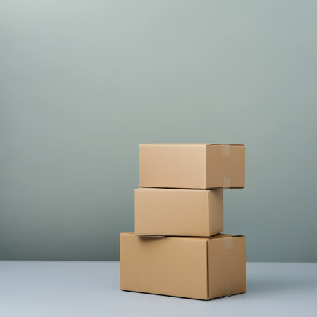 Three cardboard boxes are stacked neatly on a gray surface against a plain backdrop. The arrangement highlights their simple design.