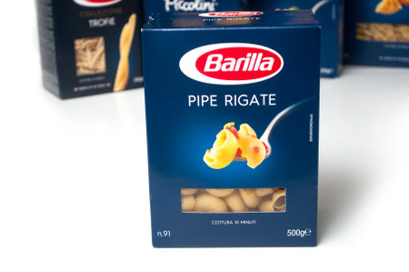 Mulhouse - France - 21 August 2019 - Closeup of pipe rigate pasta from Barilla cardboard box on white background, the famous brand of italian pasta