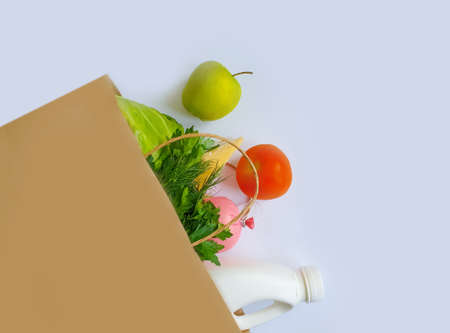 Disposable bag of kraft paper on a beautiful white background with expression 'stay home we deliver'. Beautiful white background, copy space. Covid-19 pandemic concept.