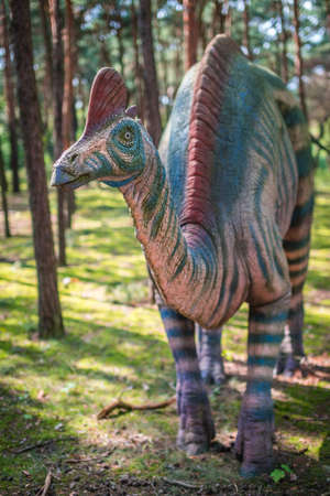 Dinosaur head close-up in the park. A giant parasaurolophus on display in the park on a sunny summer day with space to copy. High quality photo