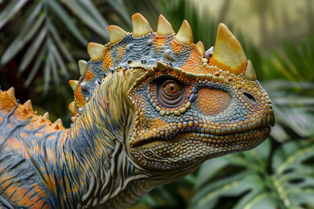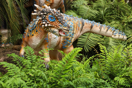 Closeup view of a lifelike dinosaur model with detailed textures among lush greenery