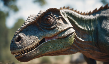 A detailed view of a dinosaur with its mouth wide open, showcasing its sharp teeth and powerful jaw muscles. The image captures the prehistoric reptile in a menacing pose, ready to strike or vocalize in its natural habitat.