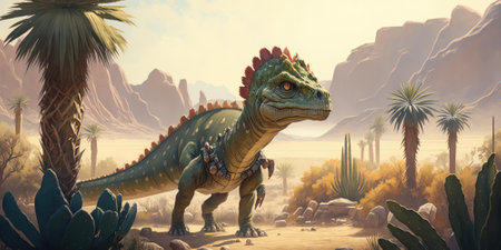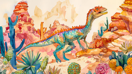 Colorful watercolor dinosaur in a desert landscape. Concept of prehistoric creatures, paleontology, art, and education.