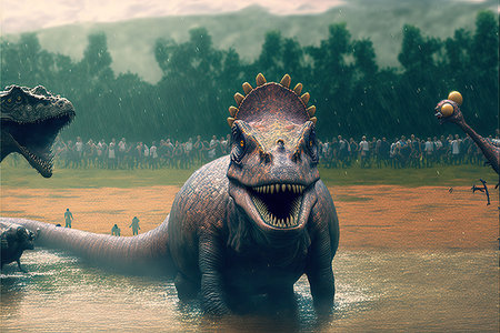 Generative ai on theme of a big scary hungry dinosaur with kind eyes and sharp teeth destroying park