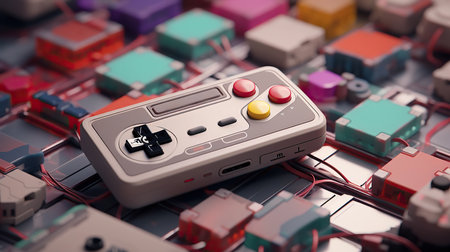 A video game controller with colorful transparent plastic buttons on a white background. Generative AI illustration.