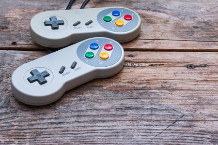 KHARKOV, UKRAINE - DECEMBER 27, 2020: Two old gamepads for 8-bit video game consoles nintendo entertainment system and nes mini on white wooden table. Old school retro gaming