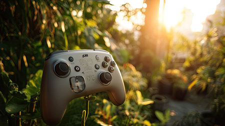 A modern gaming controller suspended amidst lush greenery, capturing the essence of outdoor entertainment during a stunning sunset. Perfect for nature and gaming enthusiasts.