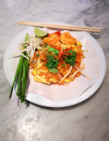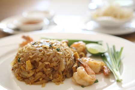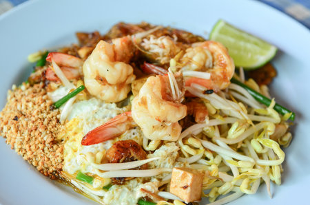 Thai fry noodle with shrimp, Pad Thai is famous street food for Thailand on table.