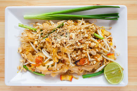 Seafood Pad Thai traditional Thai food. Stir fried noodles with shrimp peanut tofu and fresh vegetables on white plate