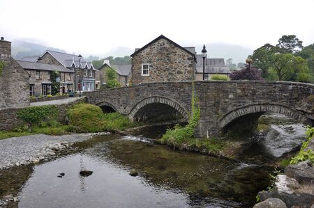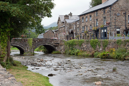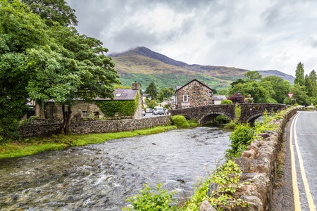 Traditional stone houses and bridge in historical mountain village Beddgelert in Snowdonia region of North Wales, United Kingdom