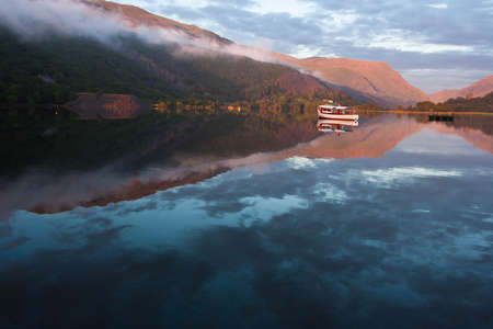 An early morning view of Coniston Water in the English Lake District. The summit of Coniston Old Man in the background is hiding in the clouds.
