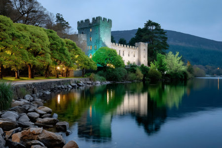 Glenveagh Castle stands illuminated on a lakeshore, reflecting in still water at twilight