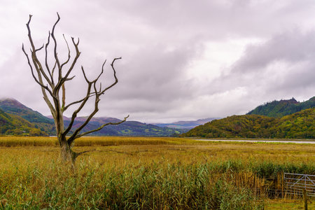 A bare tree on the LLyn Padarn lake at Llanberis in the Snowdonia area of North Wales UK