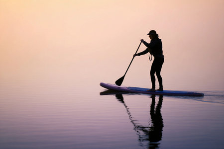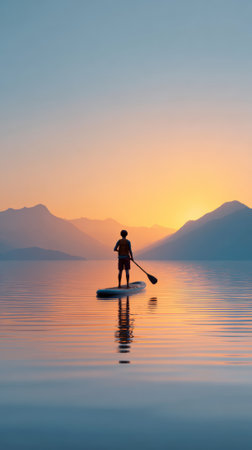 Silhouette of a man paddle boarding on a calm lake at sunset with a beautiful mountain view reflecting in the water, creating a serene and peaceful atmosphere