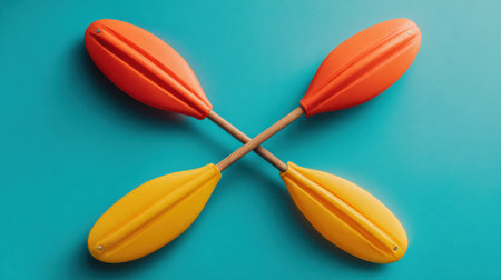 Bright orange and yellow kayak paddles are crossed on a turquoise background, highlighting their playful design and the spirit of summer water activities.