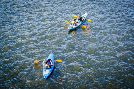 group of athletes kayak and stand up paddle on the river into the distance, kayaking