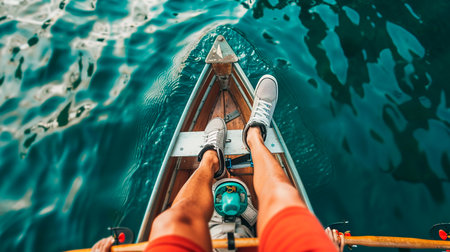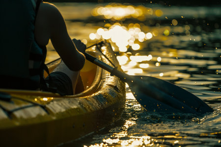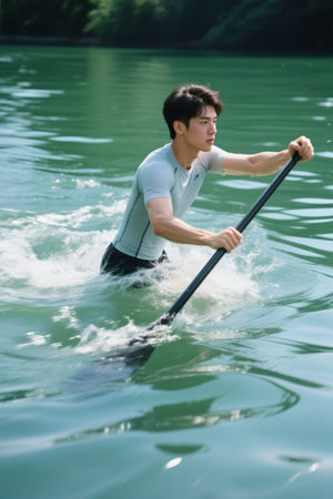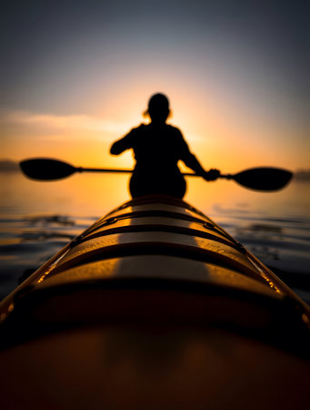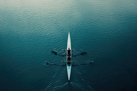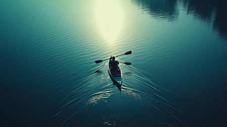 A man gracefully kayaks on the calm surface of the water. Generative AI