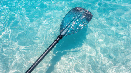 This captivating image features a close-up of a paddle resting in crystal-clear water, showcasing shimmering reflections under bright sunlight. The serene blue pool creates a peaceful atmosphere, perfect for summer adventures.
