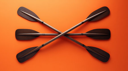 This artistic image showcases four wooden paddles crossed on a vivid orange background. It is ideal for themes related to adventure, sports, and creativity.