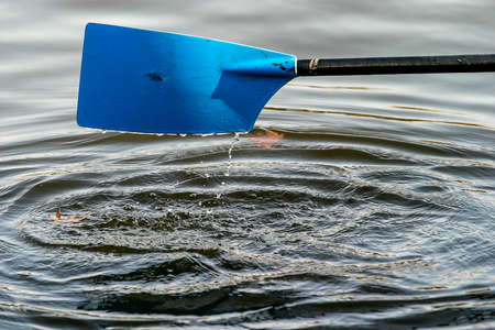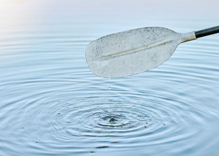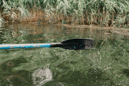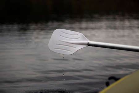 Paddle for rowing on water. Boat trip. Swimming means. The paddle blade is white.