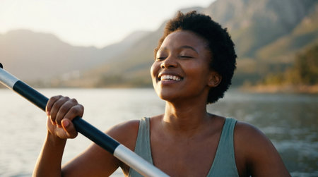 A woman smiles while paddling a canoe on a lake. The sun sets behind the mountains creating a warm light. Nature surrounds her as she enjoys this outdoor activity with joy.