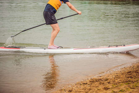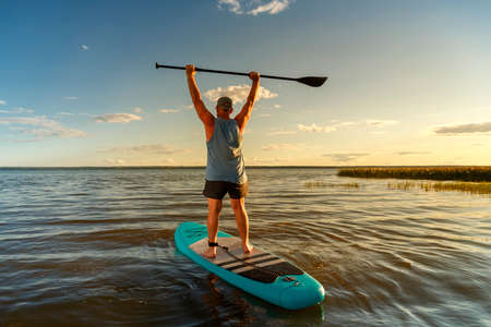 Young sportsman is paddling on a sup board on a river at sunset, enjoying the tranquility of nature and practicing his favorite watersport