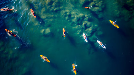 Group of people riding on top of kayaks on body of water. Generative AI.