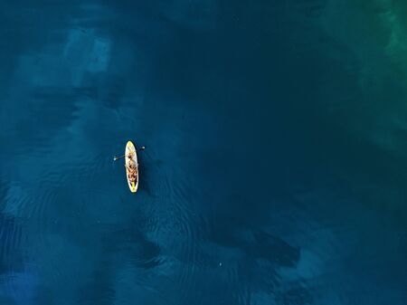 Young Man Paddling on SUP board in a blue water. High Angle View
