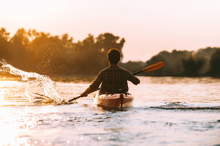 Man kayaking. Rear view of young man splashing water while kayaking on river with sunset in the background