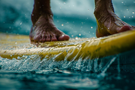 A person stands on a surfboard in the water, balancing and preparing to ride a wave, A close-up of a surfer's foot gripping the edge of a board