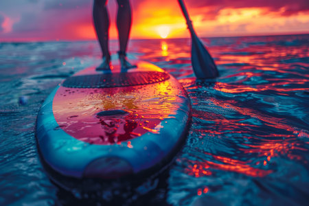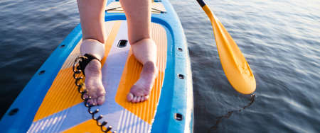 Close up back view of female legs standing on blue yellow color SUP stand up paddleboard or surfboard with paddle at sunset. Active family summer vacation time sports