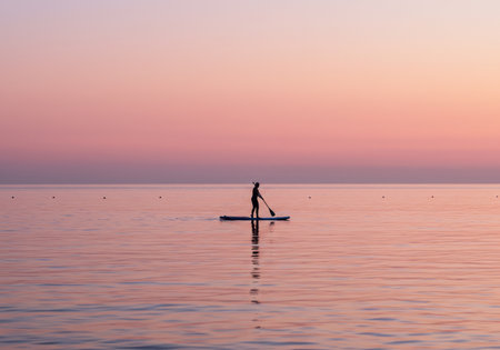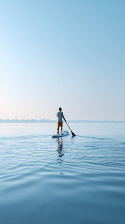 Lone paddleboarder navigates calm, expansive waters under a clear blue sky, embracing the tranquility and freedom of outdoor watersports. The horizon stretches endlessly ahead