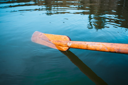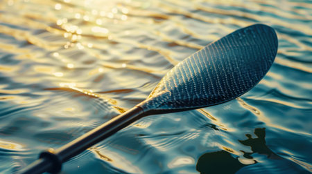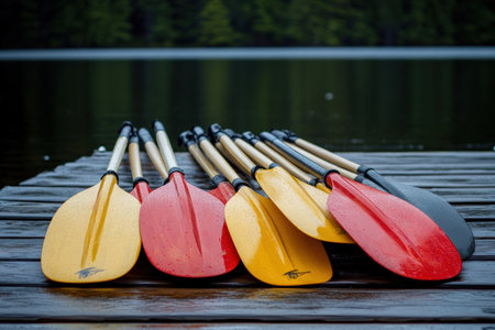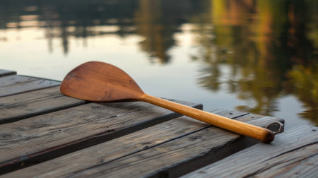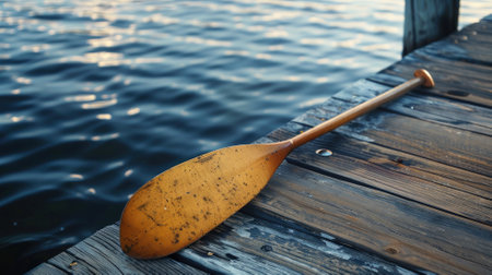 Paddle on wooden dock. Concept of canoeing as dynamic and adventurous sport.