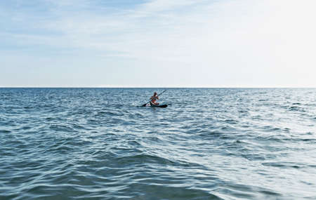 Young woman in the distance sitting and paddling on a stand up paddle board on blue sea, outdoor activities, Paddleboarding, sup, water sports