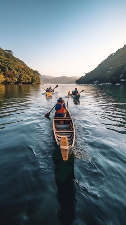 Rowing boats glide smoothly across shimmering turquoise water, creating beautiful contrast with deep blue hues. scene captures essence of teamwork and adventure