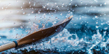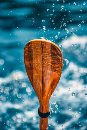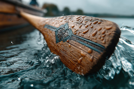 Water splashes around a detailed wooden paddle while canoeing on a tranquil lake.