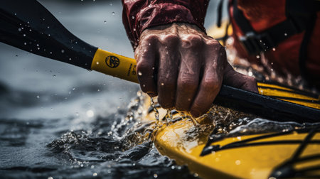 Close-up of kayaker's hand gripping paddle in challenging waters