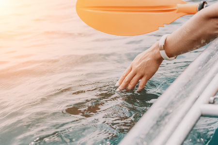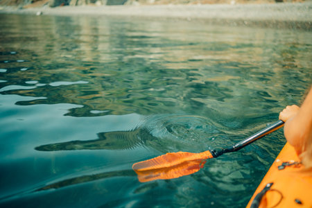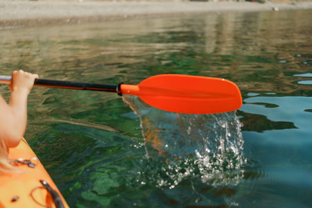 Kayak paddle sea vacation. Person paddles with orange paddle oar on kayak in sea. Leisure active lifestyle recreation activity rest tourism travel