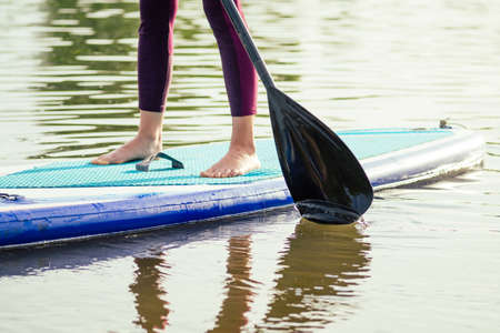 Stand up paddle boarding on a quiet sea lake , close-up of legs and water splash