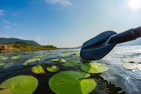 Large black kayak paddle over the surface of the lake with leaves of water lilies,