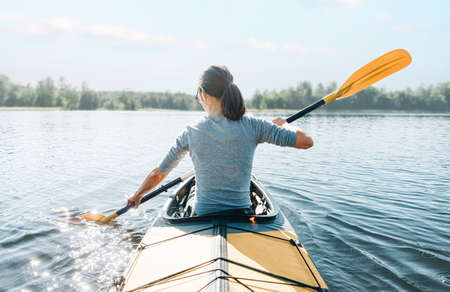 Young woman paddling in yellow color kayak on calm lake on sunny summer day, rear view.