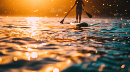 a man in shorts stands with a paddle on a SUP board at sunset in the lake. horizontal photo
