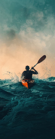 A solo kayaker paddles through vibrant waves under a dramatic sky, showcasing adventure and nature's beauty.