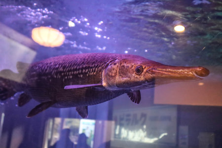 A Glimpse into Prehistory: The Majestic Alligator Gar Swimming in an Aquarium