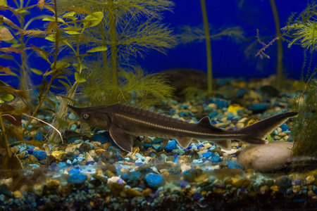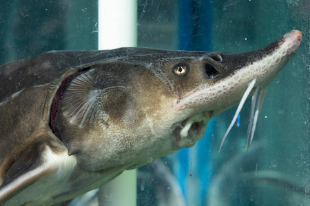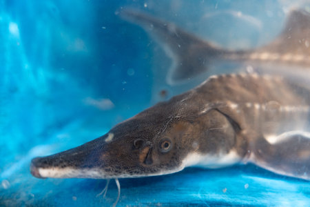 Sturgeon fish swimming in blue water tank, close-up view showing elongated snout and textured scales