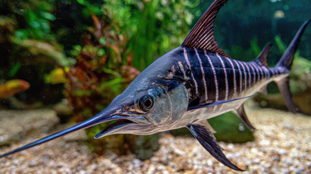 A close-up captures a swordfish in an aquarium environment. The fish displays sleek, striped patterns with a long, pointed bill. The composition is well-lit, displaying the fish against a backdrop of aquatic plants and textured substrate. This image is suitable for various commercial or editorial applications.