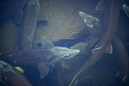 A sturgeon in the sea. Sea sturgeons in aquarium