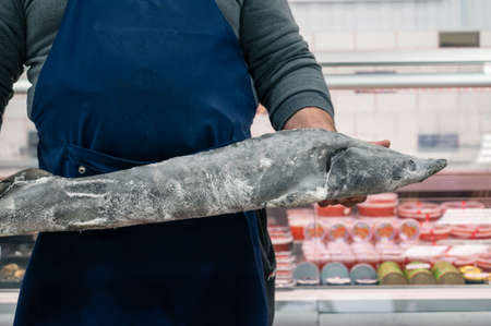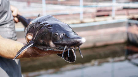 Beautiful big gray fish in the hands of a fisherman of a factory worker. Production and cultivation of sturgeons and beluga on the farm. Fishing theme