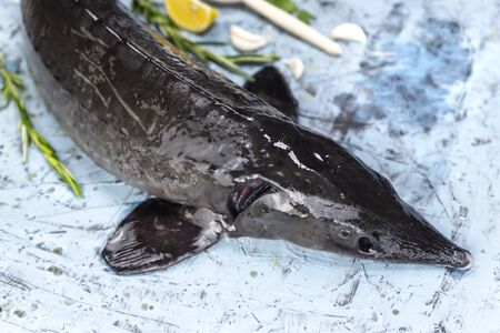 Close up view of the fresh small sturgeon fish on wooden surface. Sturgeon, farmed and commercially fished for its flesh and caviar.